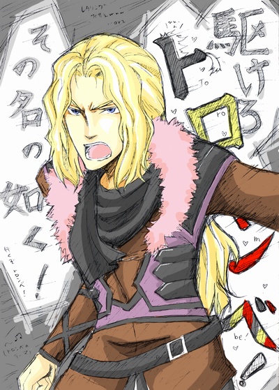 親分描いたのと同じ日に続けて描いたせいで背景の文字にかける手間がなくなってきてます。まぁいいやトロンベだし←。トロンベって言わせておけば本望だと信じてる。